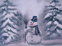 Aquarel of waterverf schilderij van een sneeuwpop in een winterlandschap tussen de besneeuwde naaldbomen. Het schilderij is in blauw grijze tinten. Het werk is heel er geschikt voor een kinderkamer.
