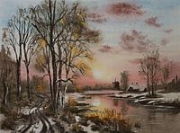 Aquarel of waterverf schilderij van een winterlandschap met een meer, en een wandelpad erlangs, tussen de bomen. De zon komt op en kleurt de lucht in prachtige kleuren.