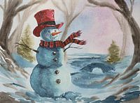 Aquarel of waterverf schilderij van een sneeuwpop in een winterlandschap. Het schilderij is whimsical en past super goed in een kinderkamer of een kinderopvang.