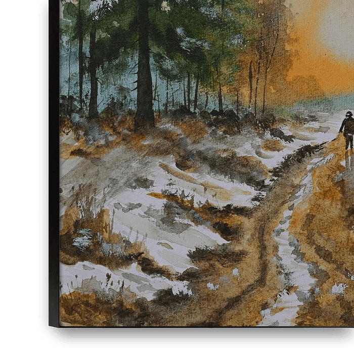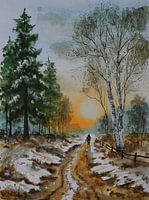 Aquarel of waterverf schilderij van een winterlandschap, met een wandelpad tussen de besneeuwde velden met naaldbomen en berkenbomen. Een wandelaar wandelt de opkomende zon tegemoet.