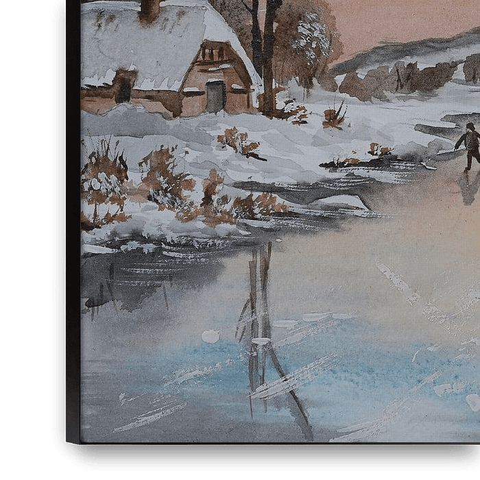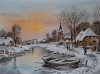 Aquarel of waterverf schilderij van een oud Hollands winterlandschap. Je ziet een bevroren rivier met een schaatser. Aan de besneeuwde oever ligt een roeibootje aangemeerd. Er staan enkele boerderijwoningen en een kerkje. De zon komt op en kleurt de lucht in prachtige tinten.