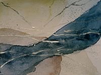 Abstract aquarel of waterverf schilderij. Je ziet verschillende kleuren beige en bruin, met een grijsblauwe diagonale band. Over het geheel lopen gouden lijnen.