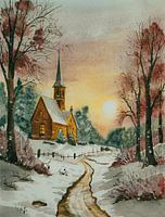 Aquarel of waterverf schilderij van een winterlandschap. Je ziet een wandelpad tussen de sneeuw en de bomen, dat naar een klein kerkje loopt, omringd door naaldbomen. De zon gaat onder en kleurt de lucht in de mooiste tinten.