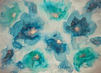 Abstract aquarel of waterverf schilderij van blauwe en turkoois bloemen. De bloemen zijn op een losse manier geschilderd, en hebben een gouden hart.