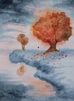 Aquarel of waterverf schilderij van een herfstlandschap. De lucht vertoont donkere wolken, terwijl de zon ondergaat. De wolken reflecteren in het beekje en de grote boom verliest langzaam zijn herfstbladeren. Super geschikt voor een kinderkamer.