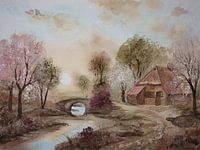 Aquarel of waterverf schilderij van een lente landschap. Je ziet een beekje met een bruggetje, een oude hoeve en enkele bloesembomen. De zon komt op. Het schilderij heeft een nostalgische sfeer.