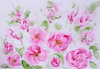 Aquarel of waterverf schilderij van wilde roze rozen. Het schilderij is op een losse manier gemaakt, waardoor de kleuren meer in mekaar overvloeien.