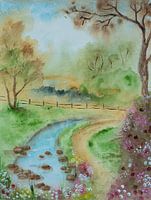 Aquarel of waterverf schilderij van een landschap met een beekje tussen de weilanden en heel veel bloeiende witte , roze en gele bloemen. Super geschikt voor een kinderkamer.