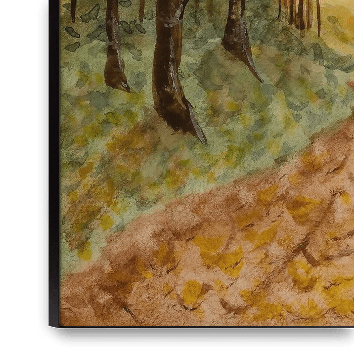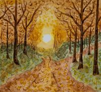 Aquarel schilderij van een bos met herfstkleuren. Het pad loopt tussen de bomen en op de achtergrond komt de zon op.