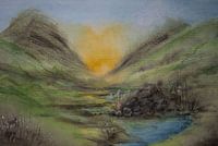 Aquarel of waterverf schilderij van een landschap met bergen en een riviertje. De zon komt op en werpt een warm licht over het dal.
