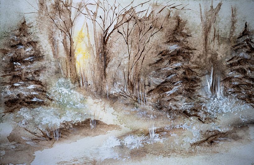 Aquarel of waterverf schilderij van een winterlandschap. Je ziet bomen en een wandelpad in de sneeuw. Het schilderij is in monotone bruine tinten.