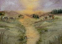 Aquarel of waterverf schilderij van een landschap met een wandelpad en kleine huisjes in de verte. De lucht kleurt oranje en paars door de zonsopkomst.
