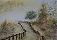 Aquarel of waterverf schilderij van landgoed Kwintelooijen in Rhenen, provincie Utrecht. Je ziet de grote trap met mist aan de grond, het is herfst en de begroeiing begint te kleuren.