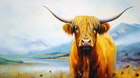 Het moderne schilderij toont een Schotse hooglander in een ruig landschap.