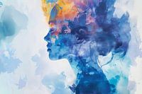 Aquarel schilderij, portret van een vrouw in profiel. De contouren van het gezicht zijn vloeiend en lossen op in de achtergrond, voor een dromerige en etherische sfeer. De zachte kleuren en vloeiende lijnen dragen bij aan een gevoel van rust en een mysterieuze sfeer. Mooi in een moderne, minimalistische of Scandinavische woonstijl vanwege de zachte kleuren en abstracte vormgeving.