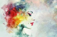 Aquarel schilderij van een mooie, jonge vrouw, met een abstracte compositie. De verschillende kleuren lopen in elkaar over. Het schilderij heeft een wazige en dromerige uitstraling. Maar is ook levendig en expressief, met een gevoel van beweging en energie. Dit schilderij kan een…