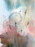 Dit figuratieve werk van enkele dandelions (uitgebloeide paardenbloemen) heeft een aquarel effect