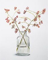 Een aquarel van rood oranje bessen aan een tak in een glazen vaas. Zeer stijlvol en passend bij de diverse trends, kleuren en interieurs van deze tijd. Zoals aardetinten, werelds, natuur, bohemien, industrieel, sober, botanisch. Een mooie aanwinst voor uw huis. Bessentak. Herfst, winter. Doorschijnende vaas