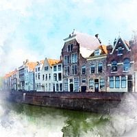 Aquarel van de Dam in Middelburg, Zeeland. Het is een van de oude kades in het historische Middelburg met prachtige panden.