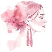 De afbeelding toont een gestileerd, vrouwelijk silhouet in zachte roze tinten. De zachte aquarelachtergrond benadrukt de elegantie van de afgebeelde vrouw, wier fijne gelaatstrekken en sluike haar harmonieus worden geaccentueerd. De lange, zwierige oorbellen zijn bijzonder opvallend en geven het beeld een extra vleugje verfijning.