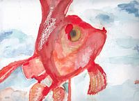 Aquarel van een goudvis. Het is een vooraangezicht dat de beweging en dynamiek van deze bijzondere vis laat zien. Het blauwe water maakt haast dat hij vliegt in een wolkenloze lucht.