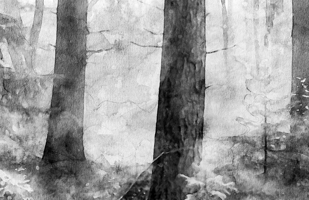 Aquarel van mistig herfstbos. Dit aquarel is digitaal gegenereerd van de originele foto. Er zijn meerdere versies van dit aquarel in deze webshop, waaronder een zwartwit versie. De originele foto wordt ook aangeboden in deze webshop.