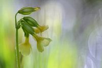 Een foto van een slanke sleutelbloem lijkend op een aquarel. De licht geel/groene tinten maken het tot een fris beeld. In de achtergrond bokehcirkels boven het water