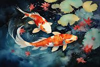 Deze dieren print aquarel toont een serene vijver, geschilderd in zachte en verfijnde tinten. Het wateroppervlak weerspiegelt de omringende natuur en creëert een rustige atmosfeer. In het heldere water van de vijver zwemmen twee prachtige koi karpers, elk met hun eigen unieke kleurpatroon en uitstraling.