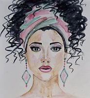 Aquarel van een mooie vrouw met zwart haar, een haarband en oorbellen. Mooie kleurrijke afbeelding voor aan de muur.
