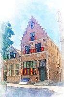 Aquarel van het pand "De Swaen" op de markt in Veere. "De Swaen" stamt uit 1579 en werd gedurende een eeuw gebruikt als herberg.