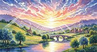 Aquarel landschap met een rivier, stenen brug, dorp en kleurrijke zonsondergang met stralend licht. Heuvels en bomen zijn op de voorgrond.