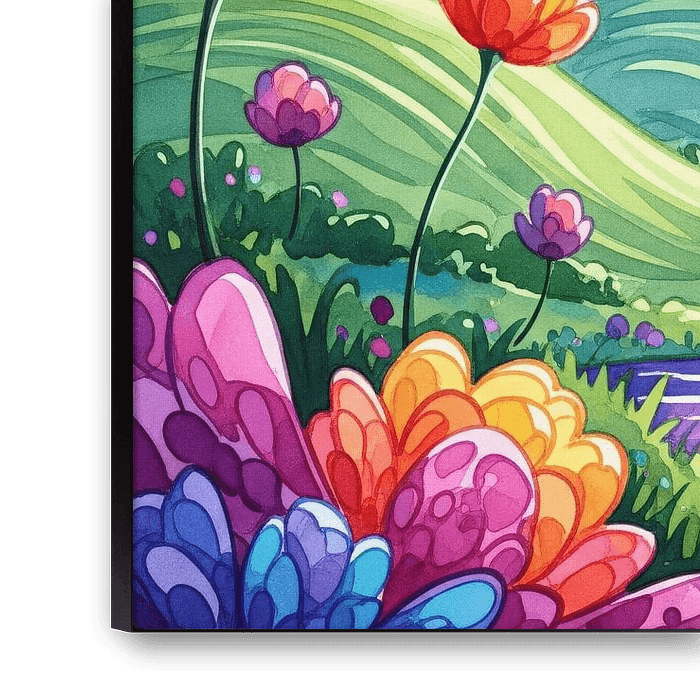 Aquarel landschap met een levendige boom, heuvels, bloemen, water en een pastelkleurige lucht met pluizige wolken en sterren.
