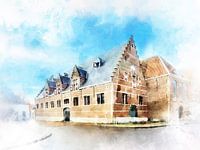 Koop dit digital art kunstwerk Aquarelschilderij van de Stadsschuur in Middelburg, Zeeland van Danny de Klerk als reproductie geprint op canvas, aluminium dibond, (ingelijste) fotoprint, behang en ArtFrame. Voor jou op maat geprint in Fine-Art kwaliteit.