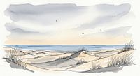 Aquarel en inktlandschap met zandduinen, oceaan, bewolkte lucht en gras. Zachte tinten beige, blauw en grijs.