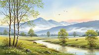 Aquarel landschapschilderij van een rivier die door een weiland stroomt met bergen op de achtergrond en grazende dieren.
