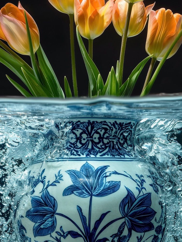 Een Delft blauwe vaas met oranje/gele tulpen, grotendeels onderwater. Splitlevel stilleven. Hoog contrast.