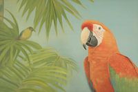 Een digitaal schilderij van elegante Ara Papegaai omringt door groene bladeren. Het werk geeft een dromerige en rustieke uitstraling aan uw interieur!