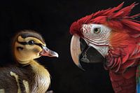 Op zoek naar een uniek kunstwerk voor je interieur? Bekijk deze levendige foto van een rode ara en een eend die elkaar nieuwsgierig bekijken. Perfect voor een modern of klassiek interieur!