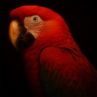 Een scharlakenara poseert statig in een warme, zachte belichting. De diepe rode veren, subtiel overlopend in tinten van groen en blauw, komen krachtig naar voren tegen de donkere achtergrond. De vogel straalt elegantie en intelligentie uit in dit fijnzinnig belichte portret.