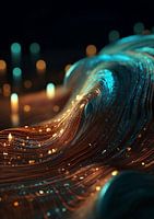 We zien golvende lijnen die overlopen van kopergoud naar een aquamarijn/turquoise met in de verte kleine lichtpuntjes.