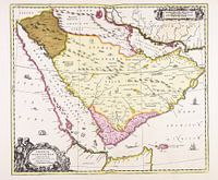 Landkaart van o.a. Saudi Arabië, Jemen, Oman, de Emiraten, Watar, Bahrein, Koeweit. Verder de kust van een stuk Afrika en Perzië of Iran.