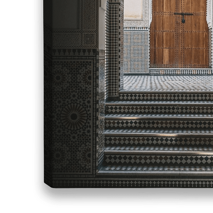 Deze foto is gemaakt in Marokko en toont een doorkijkje in een traditioneel gebouw. Op de voorgrond zie je een boog die dienstdoet als poort. Onder de poort leidt een kleine trap naar een betegelde vloer. De vloer is bedekt met mozaïektegels in verschillende geometrische patronen. De tegels lopen door op de onderste helft van de muur,…