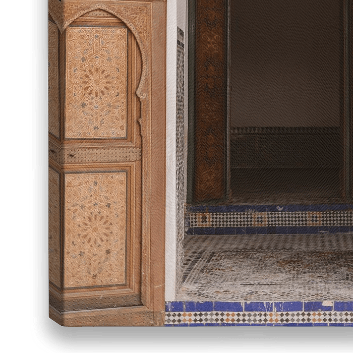 Op deze foto is een doorkijk te zien in het Bahia paleis in Marrakech. De houten deuren met prachtig arabische handwerk erin verwerkt. Het is een doorkijk waarbij je steeds meer nieuwsgierig word naar wat er voorbij de volgende deur te zien is. Met dit beeld haal je arabische kunst in huis.