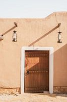 Op deze foto zie je een houten arabische deur en een lemen, perzik kleurige muur. Boven de deur hangen twee lampen.