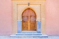 Deze foto is gemaakt in Marokko en toont een gevel met een duidelijke Arabische architectonische stijl. Op de afbeelding zie je een roze muur waarin twee houten deuren zijn geplaatst. Beide deuren zijn bereikbaar via een kleine trap met drie treden. De voorkanten van deze treden zijn bekleed met blauw-witte tegels in geometrische…
