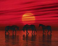 Drie Arabische paarden stappen door de zee bij een rode zonsondergang Dit kusttafereel kan in verschillende formaten en op verschillende materialen worden afgedrukt. Zowel op canvas, hout, metaal of ingelijst zodat het zeker in uw interieur past.