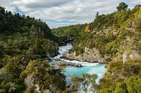 De Aratiatia Rapids liggen iets verder van de Huka falls in Nieuw Zeeland in de buurt van Taupo. Het blauwe water en de groene bomen en platen steken lekker tegen elkaar af.