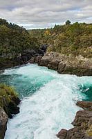 De Aratiatia Rapids liggen iets verder van de Huka falls in Nieuw Zeeland in de buurt van Taupo. Het blauwe water en de groene bomen en platen steken lekker tegen elkaar af.