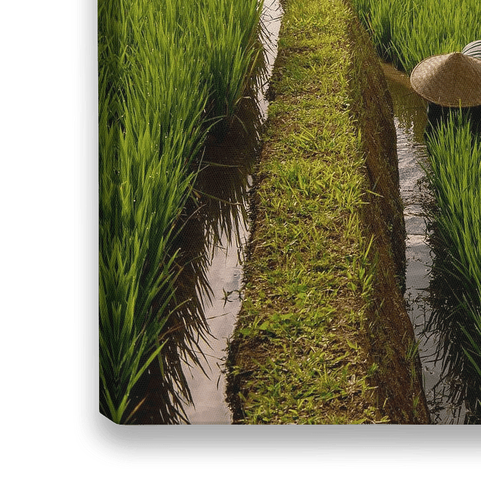 Een groepje vrouwen aan het werk in een rijstveld van Jatiluwih op het eiland Bali, Indonesië. Op de achter grond zijn nog meer rijstterrassen zichtbaar en enkele palmbomen. De vrouwen dragen typische Aziatische rieten hoedjes.