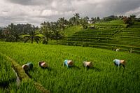 Een groepje vrouwen aan het werk in een rijstveld van Jatiluwih op het eiland Bali, Indonesië. Op de achter grond zijn nog meer rijstterrassen zichtbaar en enkele palmbomen. De vrouwen dragen typische Aziatische rieten hoedjes.